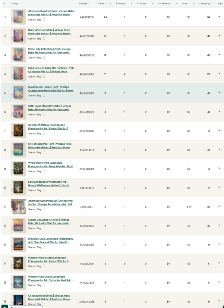 - Etsy에서 “retro cafe wall art printable”, “vintage travel poster set”를 검색해 상위 20개 리스트의 가격, 썸네일, 타이틀 구조, 태그를 연구하고, 직접적인 카피가 아닌 패턴만 가져오세요.