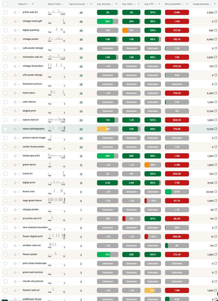 - prints wall art, wall art, posters, digital art print, home decor 등은 검색량이 매우 높지만 경쟁도 수백만 단위라서, 제목과 태그에서 비중을 줄이고 보다 구체적인 롱테일 키워드를 늘리는 것이 좋습니다.