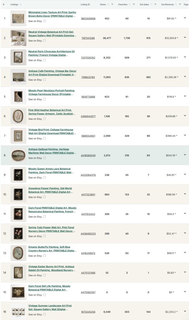 • “digital download art, printable wall art”처럼 너무 일반적인 태그 비중이 높아, 일부는 더 구체적인 롱테일로 교체하는 것이 신규 샵에는 더 효과적입니다.​