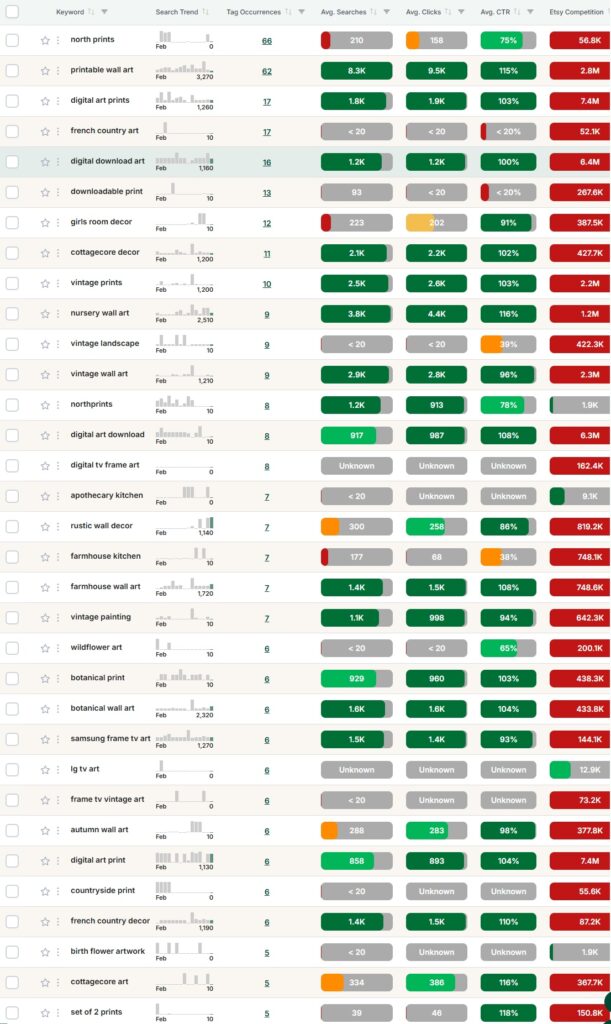 NorthPrints의 eRank 스크린샷(첨부 이미지) 기준 상위 키워드를 보면 “printable wall art, digital art prints, nursery wall art, vintage wall art, samsung frame tv art, botanical print, cottagecore decor” 등, 대부분 초경쟁 키워드입니다. 이 말은:​