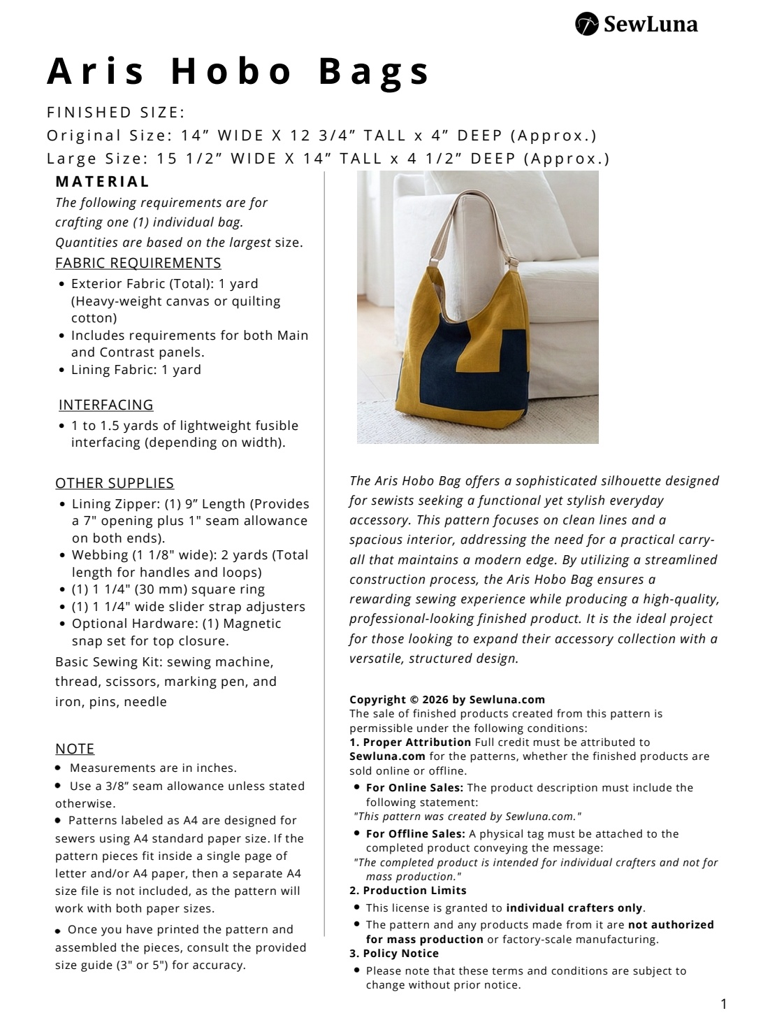 Aris Hobo Bag 2 Sizes Sewing Pattern PDF | Slouchy Tote Bag Template