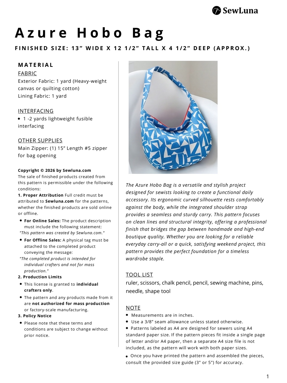 The Azure Hobo Bag is a versatile and stylish project designed for sewists looking to create a functional daily accessory. Its ergonomic curved silhouette rests comfortably against the body, while the integrated shoulder strap provides a seamless and sturdy carry. This pattern focuses on clean lines and structural integrity, offering a professional finish that bridges the gap between handmade and high-end boutique quality. Whether you are looking for a reliable everyday carry-all or a quick, satisfying weekend project, this pattern provides the perfect foundation for a timeless wardrobe staple.