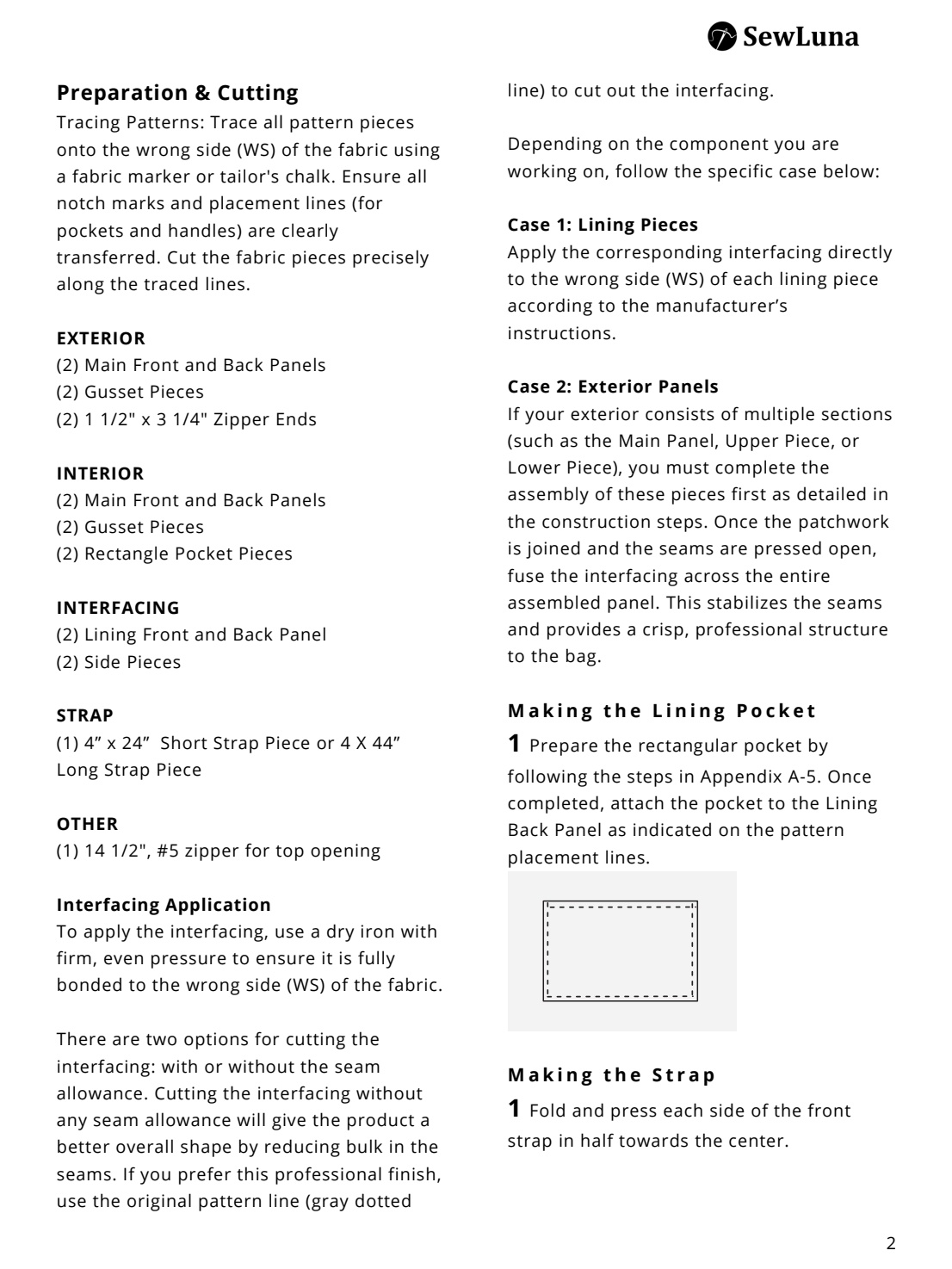 • Interfacing: Medium-weight fusible woven interfacing for the main body; optional fleece or foam stabilizer for added structure.